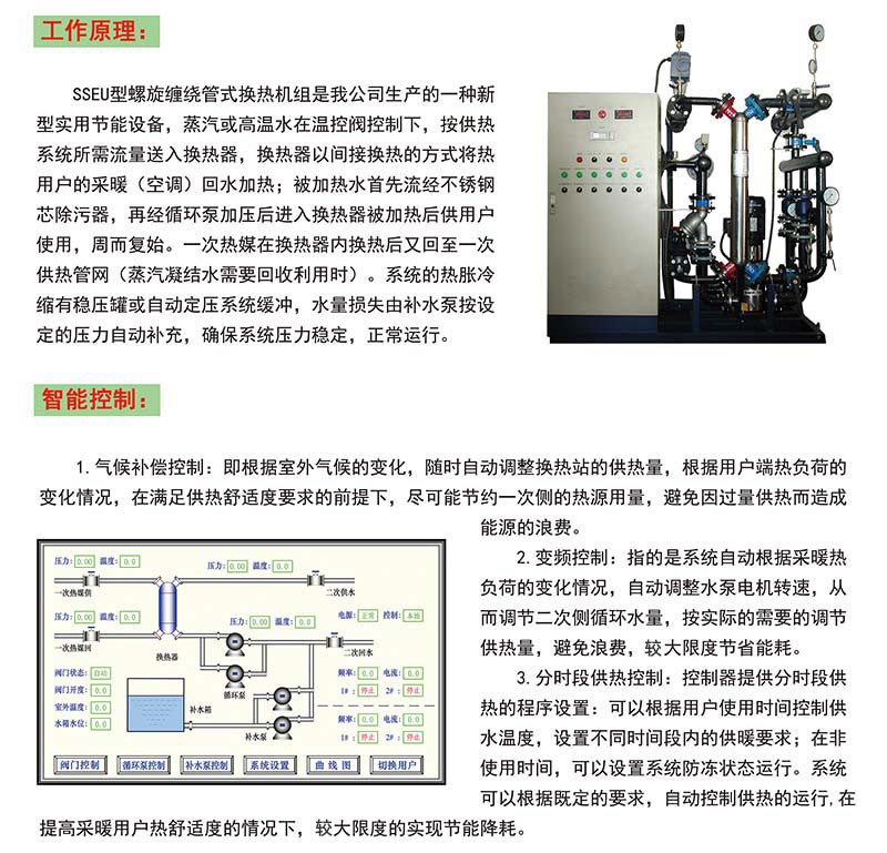 螺旋纏繞管式換熱機(jī)組是集成了雙科螺旋纏繞管式換熱器、循環(huán)泵、補(bǔ)水泵、溫度計(jì)、壓力表、各種傳感器、二次側(cè)管路、閥門及工控于一體的成套區(qū)域供熱設(shè)備。同時(shí)結(jié)合先進(jìn)的控制技術(shù)以及豐富的經(jīng)驗(yàn),為用戶量身定做更合適的、性能優(yōu)良的換熱系統(tǒng)解決方案。