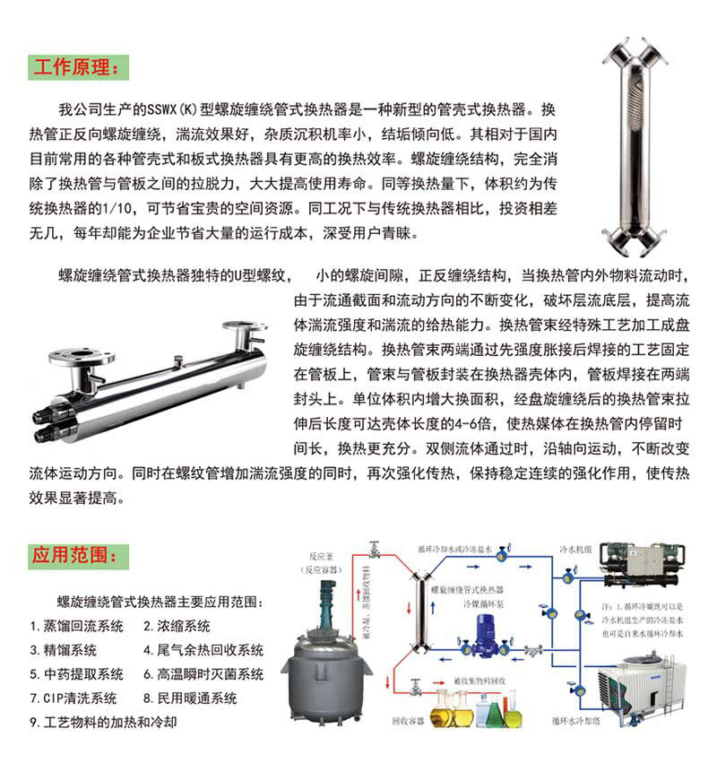 螺旋纏繞管式換熱器是我公司在引進先進換熱技術的基礎上,與山東建筑大學聯(lián)合研制開發(fā)的新型換熱設備。是新一代換熱產品中的代表作品,主要適用于汽-液換熱工況,與其他形式的換熱器相比,換熱系數(shù)提高1-3倍,廣泛應用于制藥、精細化工、食品飲料、石油化工、熱電聯(lián)產、洗浴、區(qū)域供熱等場合。